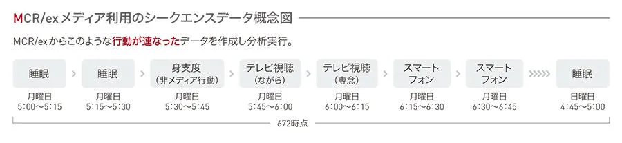 具体的な調査データには、当社の「MCR/ex」が用いられました。これは、生活者の1日の行動の流れを15分刻みに、性年代別はもちろん、意識や嗜好別に捉えることができるデータベースです。「MCR/ex」は、全国7地区、合計1万人を対象に、生活行動・メディア接触を1週間の日記形式で調査しており、そこから15分ごとに捉えた672時点のデータを採取し、行動パターンを探りました。その結果、生活者のメディア行動と、テレビ受像器における動画視聴に関して、新たな知見を得られました。