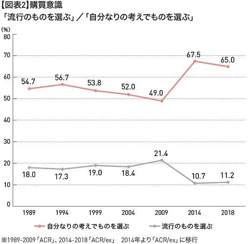 逆に、流行に流されない意識である「自分なりの考えでものを選ぶ」については、2014年から上昇しており、近年「みんな」と同じものではなく個人の価値観や考えを尊重して判断する志向が高まっていることがわかります。
