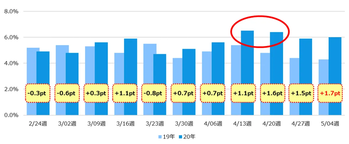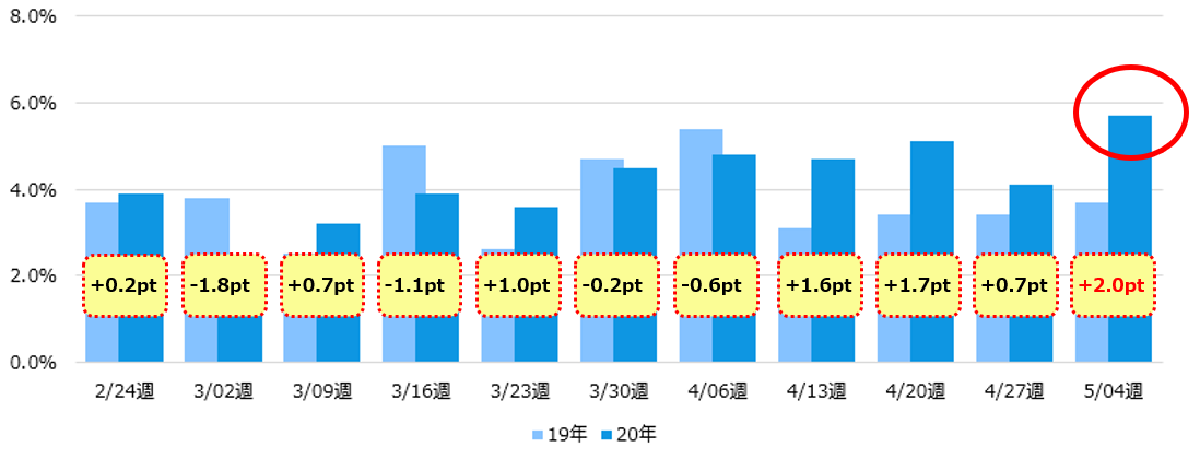 ※期間:2月第4週~5月第1週の前年同週比較(横軸の日付は2020年のもの)