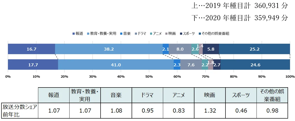 ・ジャンル別の番組本数は、「教育・教養・実用」が前年比約1.16倍。各局のワイドショーや時事解説番組などで、コロナ関連の報道が増加。一方「スポーツ」は大幅に減少。「ドラマ」は例年通り。