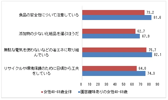 まず、園芸を趣味とする40代以上女性(以下、園芸趣味の女性)の生活に対する意識をみてみます。(図5) 40代以上女性全体(以下、一般女性)と比べると「食の安全性に注意している」「添加物の少ない化粧品を選ぶ」「省エネに取り組んでいる」「リサイクルや環境保護のために日頃から工夫をしている」など、製品の安全性・品質やエコに関する質問で5ポイント(以下、p)以上高くなっています。園芸趣味の40代以上女性は、健康配慮への意識が高く、添加物が少ないオーガニック製品や自然由来の製品を嗜好し、またエコへの関心が高い人たちの割合が多いと言えそうです。