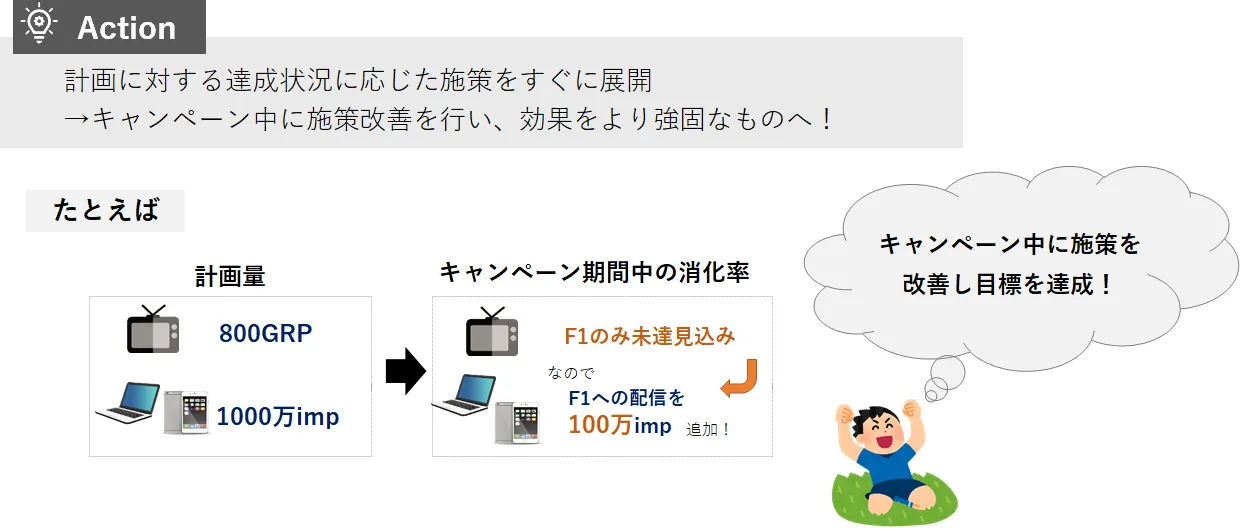 Aさんのように、キャンペーンの出稿期間中でも施策改善をスムーズに行うことができるようにするためには、あらかじめどのような視点でテレビCMの出稿結果を確認するのか、その「結果の見方」や「結果に応じたアクション」をパターンで決めておくなどの"ルール作り"も肝要です。