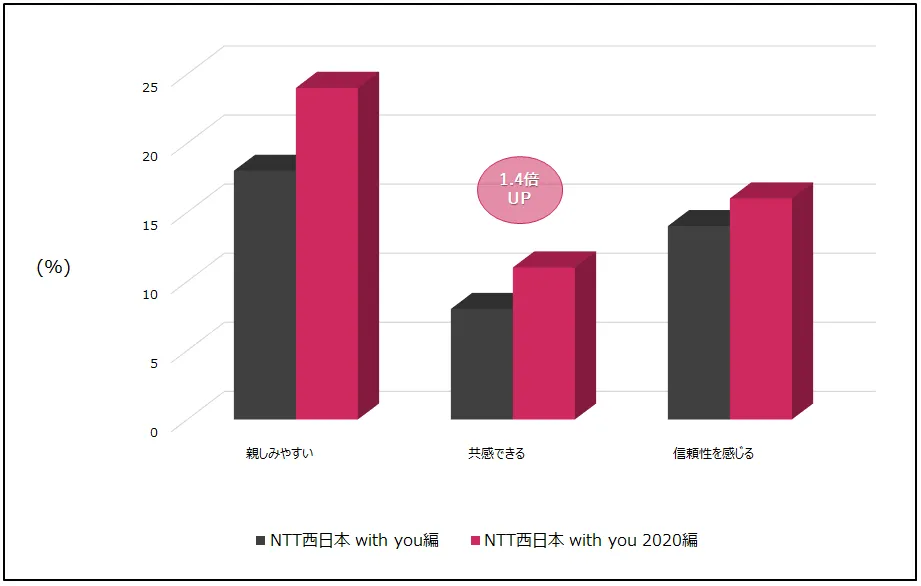 ここでは、企業イメージCMとして「NTT西日本」のCM評価を見てみました。CMの場面は、with you編では今までの生活では当たり前であった、対面会議などの場面が登場しますが、with you 2020編では「リモート会議」「オンライン面接」等のニューノーマルへ変化しています。男女15-69才の評価の比較をしてみると、「親しみやすい(1.3倍UP)」「共感する(1.4倍UP)」のスコアが高くなり、更には「信頼感を感じる(1.1倍UP)」についても高くなっていることが分かりました。ニューノーマルを反映したところ、生活者からより親近感を得ることができていると考えられます。(図4)