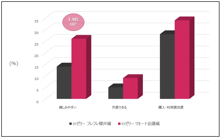 さらに【事例2】と同様にCMの場面が「オフィス」から「リモート会議」となった、「森永製菓 in ゼリー」のCMを比較しました。こちらもCM内容から、SanSan同様ターゲット層をビジネスマンとして、「男性35-49才」の評価を確認しました。こちらも同様の傾向で「親しみやすい(1.9倍UP)」「共感する(1.8倍UP)」のスコアが高くなり、更には「購入・利用意向度(1.2倍UP)」についても高くなっていることが分かりました。 (図6)