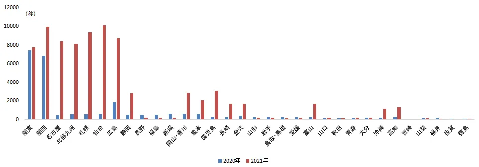 図表1を見ると、昨年と比較して今年の出稿秒数が増加している地区が、関西をはじめとして増えていることがわかります。関西の他にも、名古屋・北部九州・札幌・仙台・広島で出稿秒数が大きく増加しており、昨年のGW期間よりも、サービスの浸透や利用が促進した地区の拡大がうかがわれます。