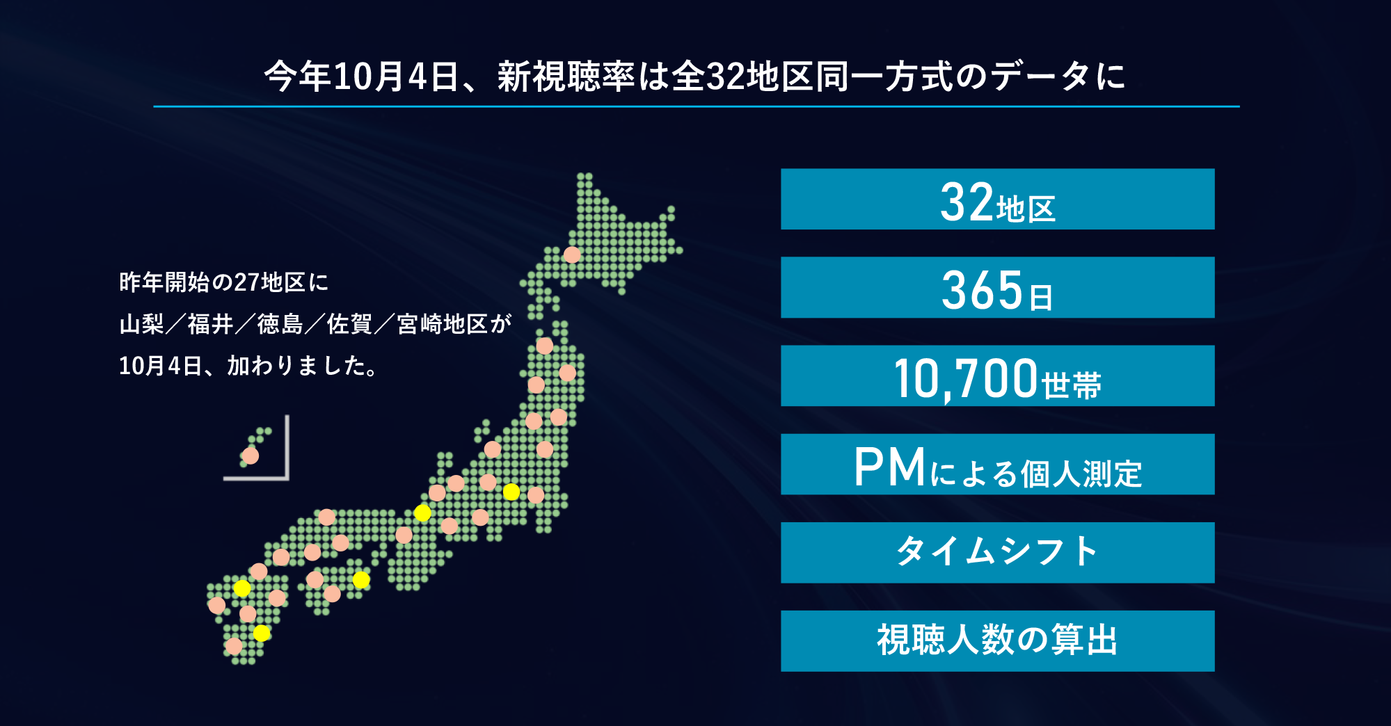 私どもの最大の事業である視聴率事業は、昨年4月より「新視聴率」として、新たなスタートを切りました。「新視聴率」は毎日、個人単位でタイムシフトも加味して測定を行っていますが、10月4日には山梨・福井・徳島・佐賀・宮崎の5地区が加わり、名実ともに全国すべての放送エリアにおける同一測定方式の導入が達成されました。これも、創業以来59年間にわたる放送局様、広告会社様、広告主様の多大なご尽力によるものです。ビデオリサーチは今後も「新視聴率」の正確、迅速な運用に注力してまいります。