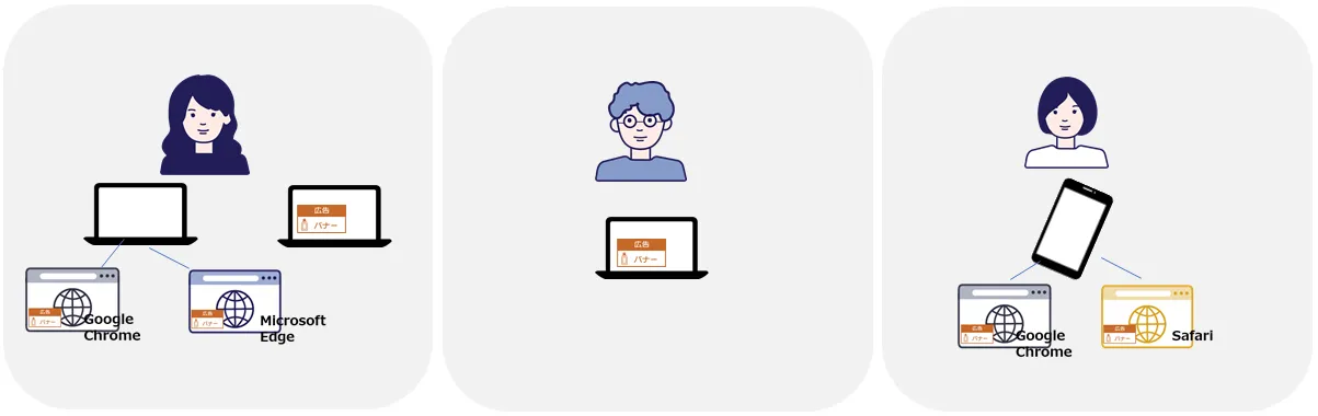 左の女性は、片方のPCで2つのブラウザを使用しており、それぞれで広告がリーチしているので2+1=3UBとなります。