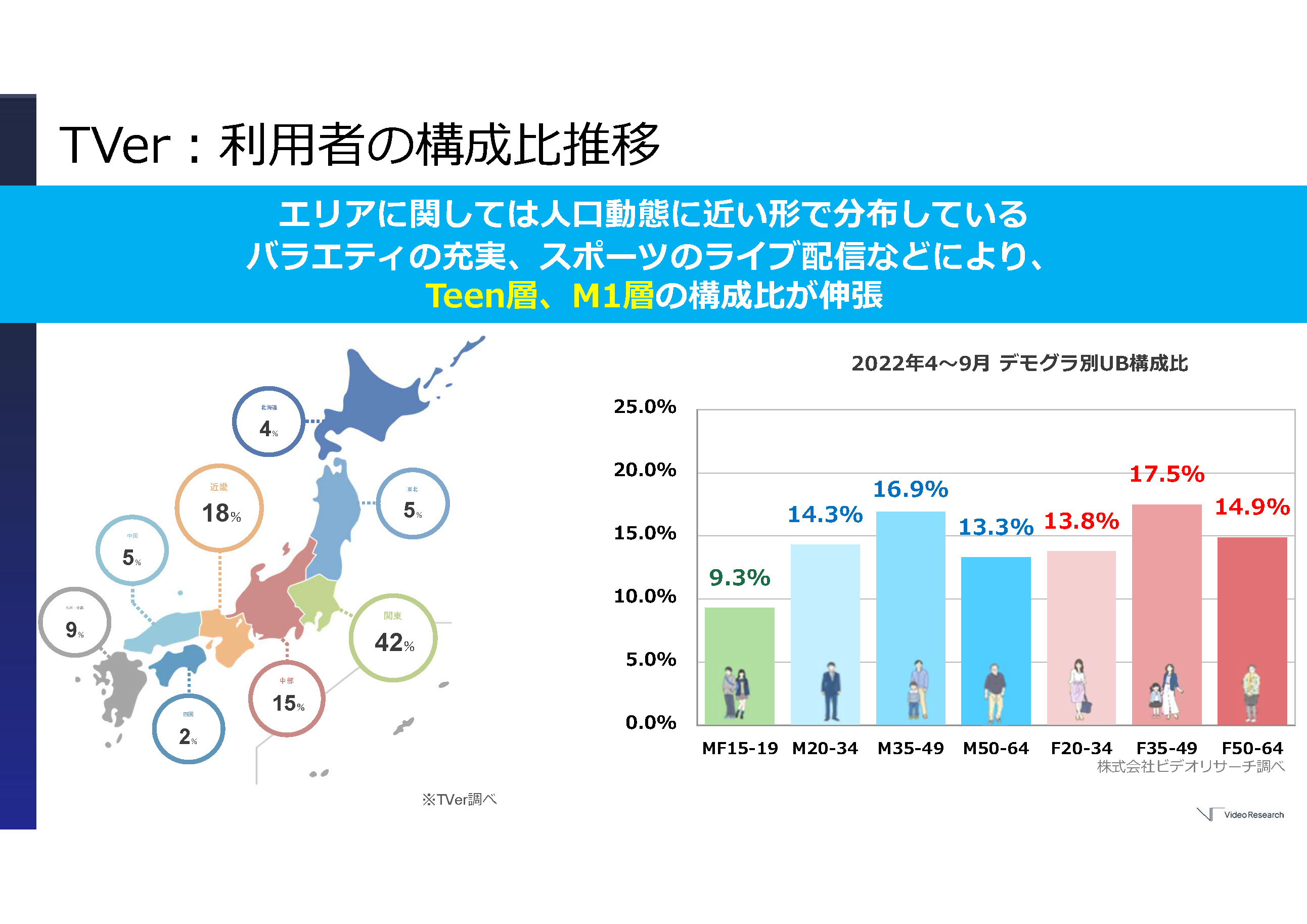 利用者構成比は人口動態に近い形で分布しており、全体の31.3%を占めるF1(女性20~34歳)層・F2(女性35~49歳)層に加えて、Teen(ティーン/男女15~19歳)層やM1(男性20~34歳)層の割合も増加。ビデオリサーチの調査ではライブ配信・DVR(見逃し配信)の新規ユーザーにTeen層と男性層が圧倒的なシェアを持つなか、その約半数がTVerに定着しています。