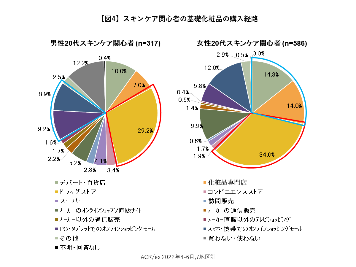 次に、スキンケア関心者が基礎化粧品をどこで購入しているのか(購入経路※)を【図4】に示しています。