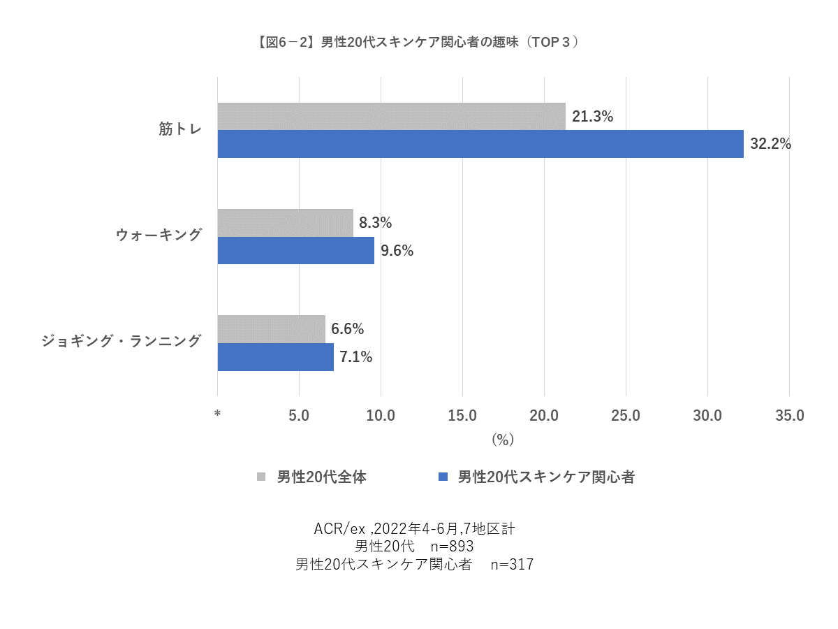 さらに、彼らのスポーツの趣味をみると、「筋トレ」「ウォーキング」「ジョギング・ランニング」がTOP3を占めており、中でも「筋トレ」の割合が20代男性全体より10%程度高くなっています。このことから、スキンケアに関心がある若者男性はスキンケアだけでなく、ボディケア意識も高いことがうかがえます。体のメンテナンスにも気を配って自分磨きに励む彼らの姿が目に浮かぶようです。