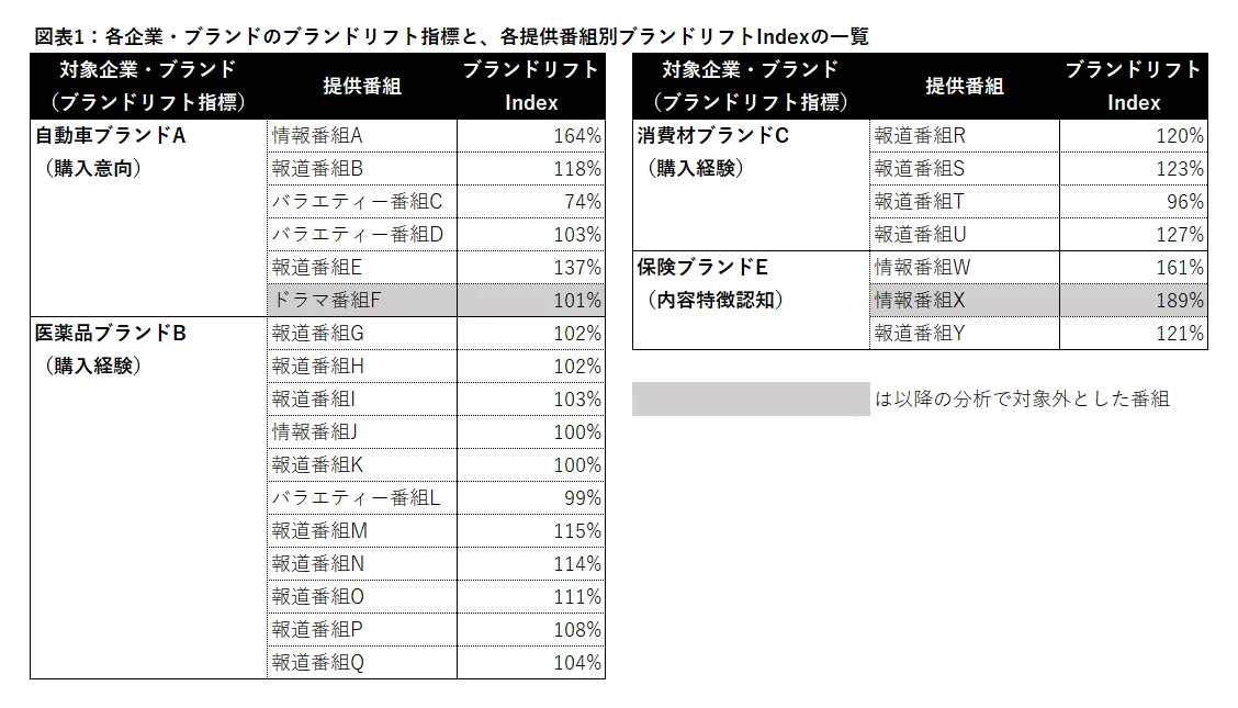 それぞれの提供番組別ブランドリフトIndexは(図表1)の通りでした。
