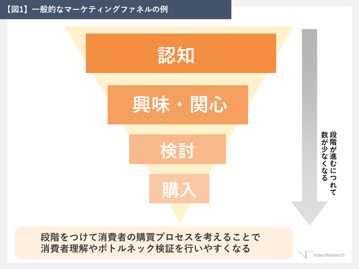 これは先ほど例に挙げた認知~購入までのプロセスを表し、(図1)で示されます。