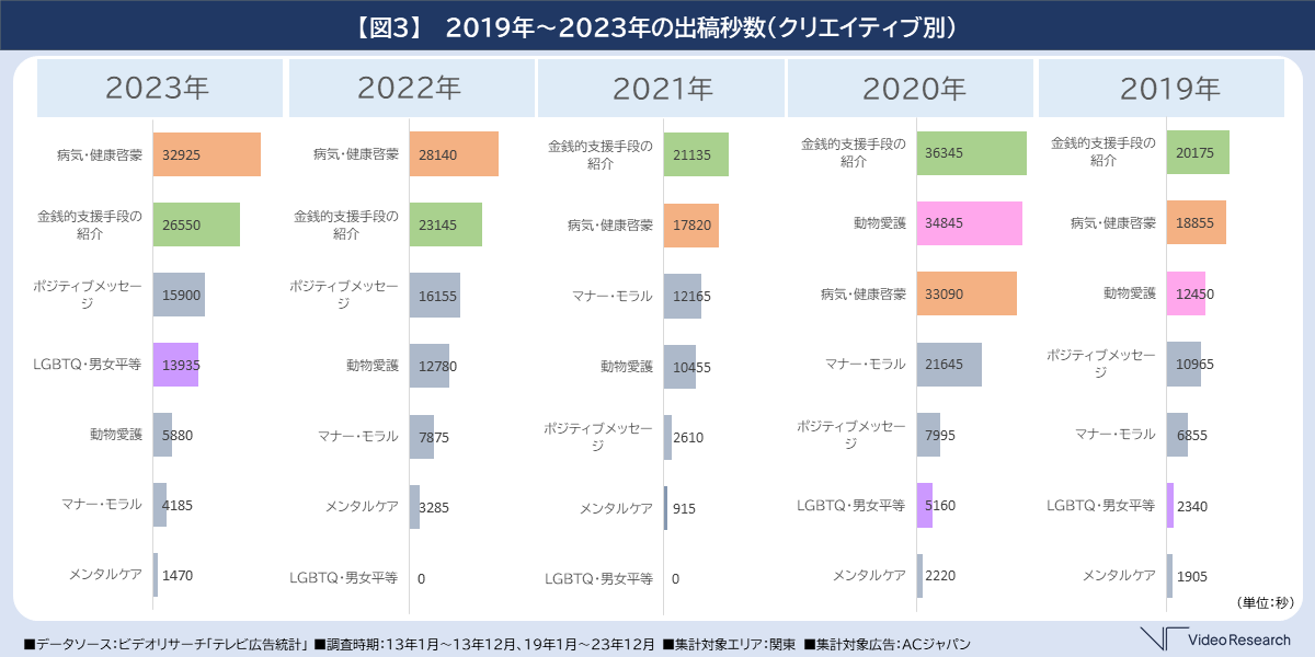 次に、出稿されているテレビCMのクリエイティブ別に、2019年~2023年における出稿量の推移を見ていきます。