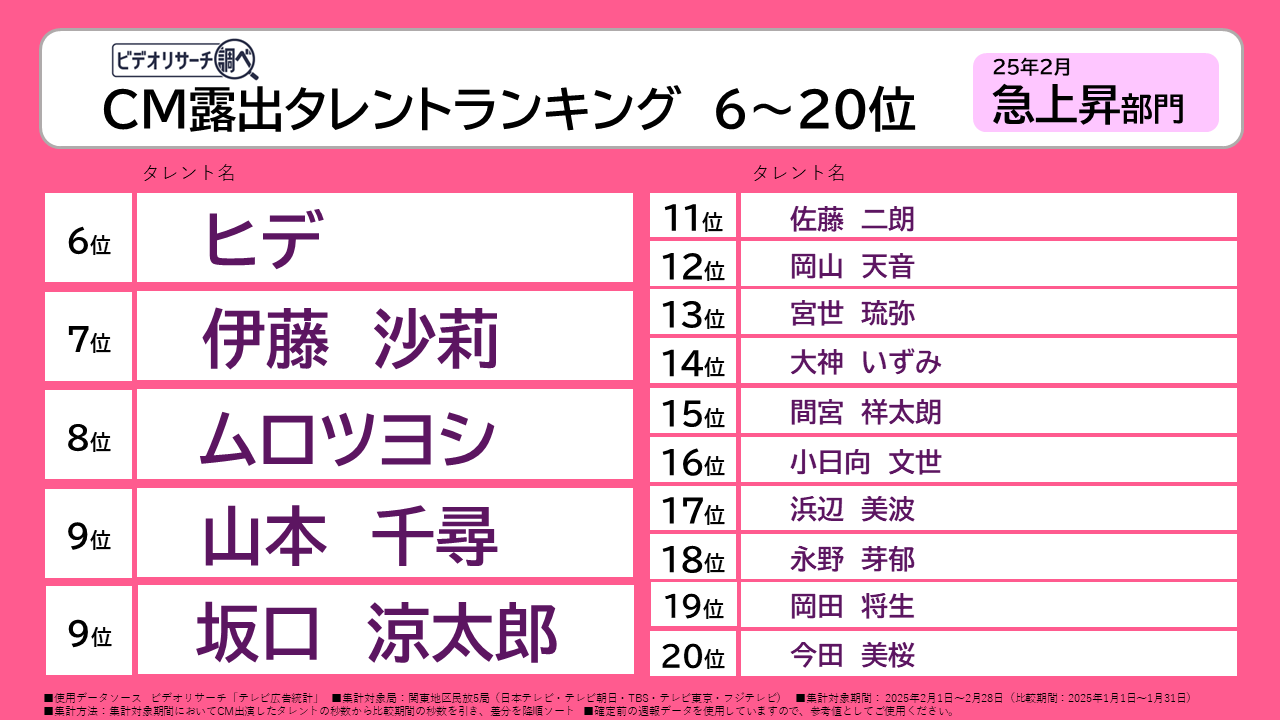 2025年2月におけるCM露出タレントランキング「急上昇部門」TOP20はこのようになりました。