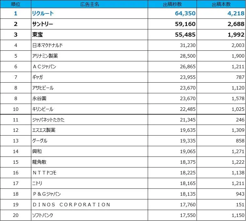 【25年3月版】広告主テレビCM出稿秒数ランキングTOP20