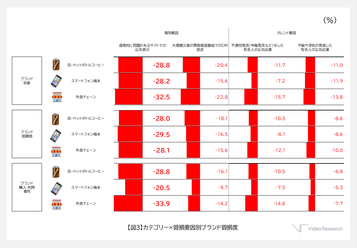 各指標は11段階(1:とてもあてはまる ~ 11:まったくあてはまらない)で回答してもらい、「あてはまる」に該当する選択肢のうち上位3段階の比率について集計しました。図3では、各カテゴリーと毀損要因の組み合わせごとに、シナリオ提示前と提示後のブランド評価の差分を示しています。
