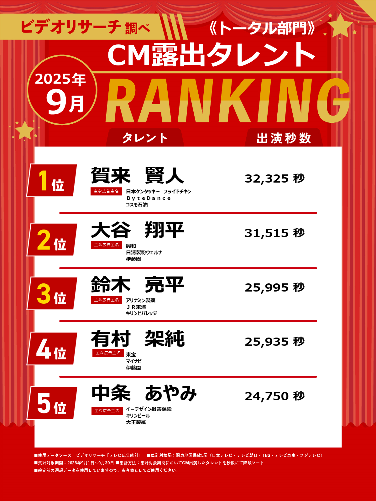 2025年9月におけるCM露出タレントランキング「トータル部門」TOP5はこのようになりました。