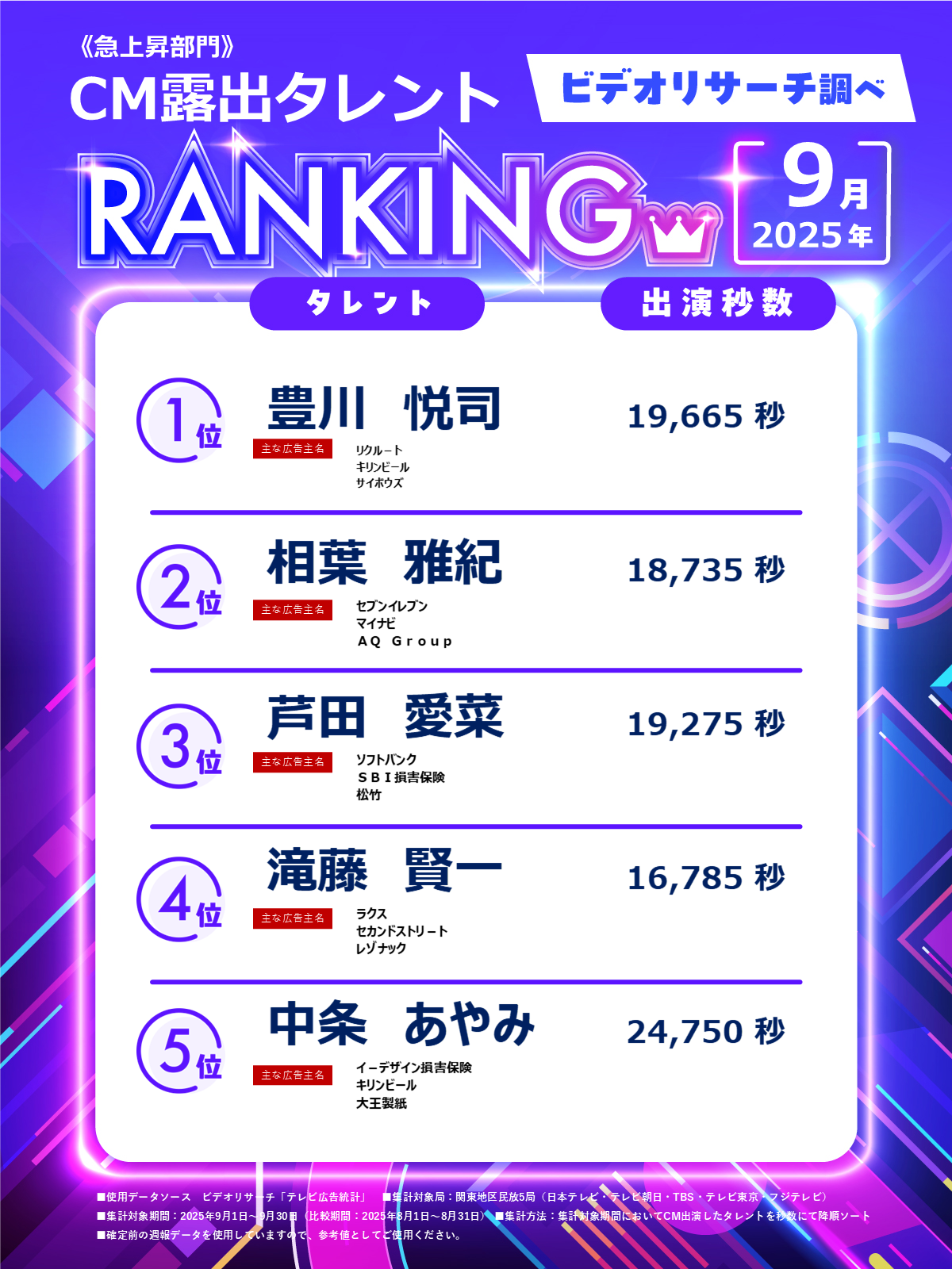 2025年9月におけるCM露出タレントランキング「急上昇部門」TOP5はこのようになりました。