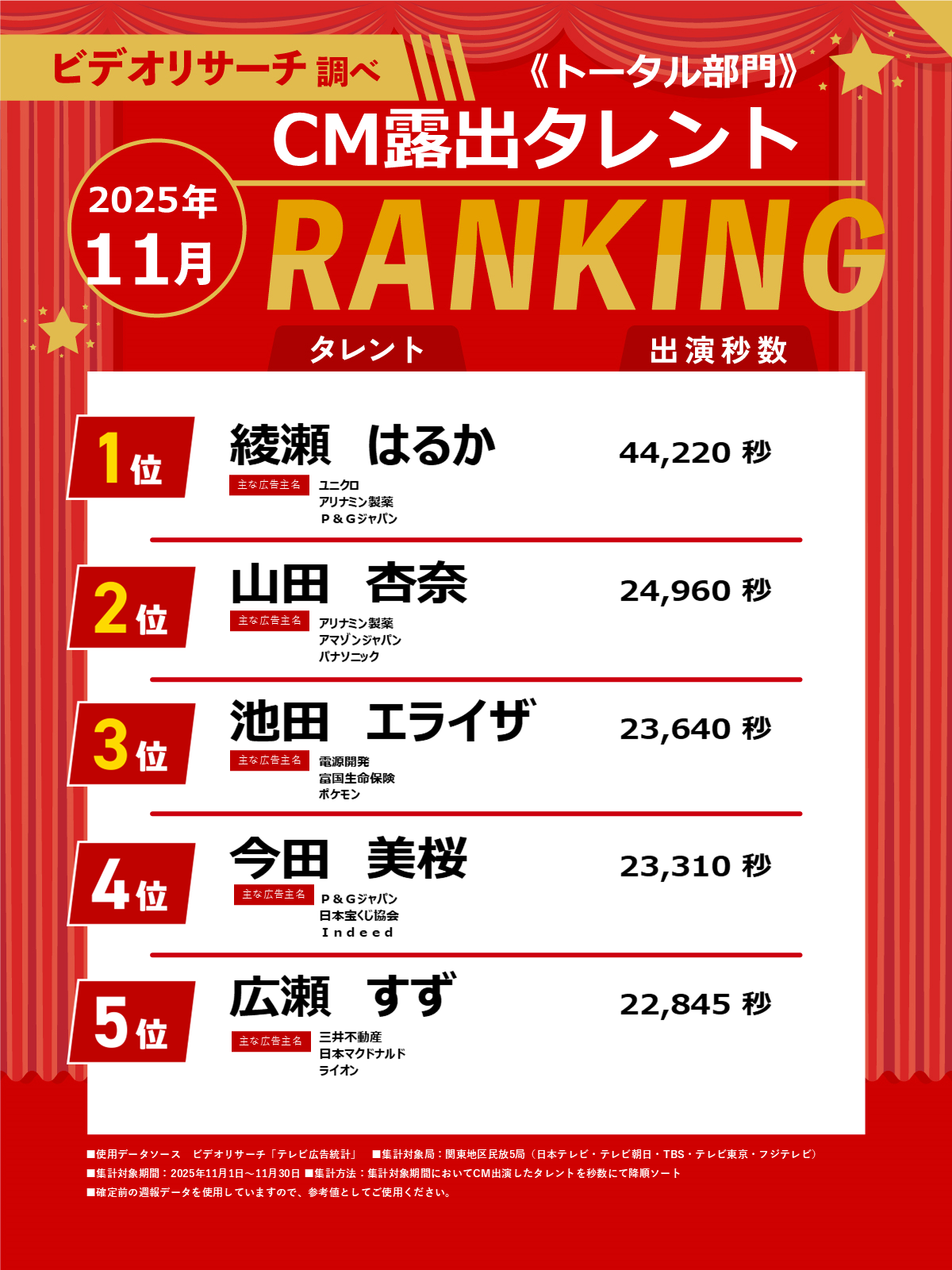 2025年11月におけるCM露出タレントランキング「トータル部門」TOP5はこのようになりました。