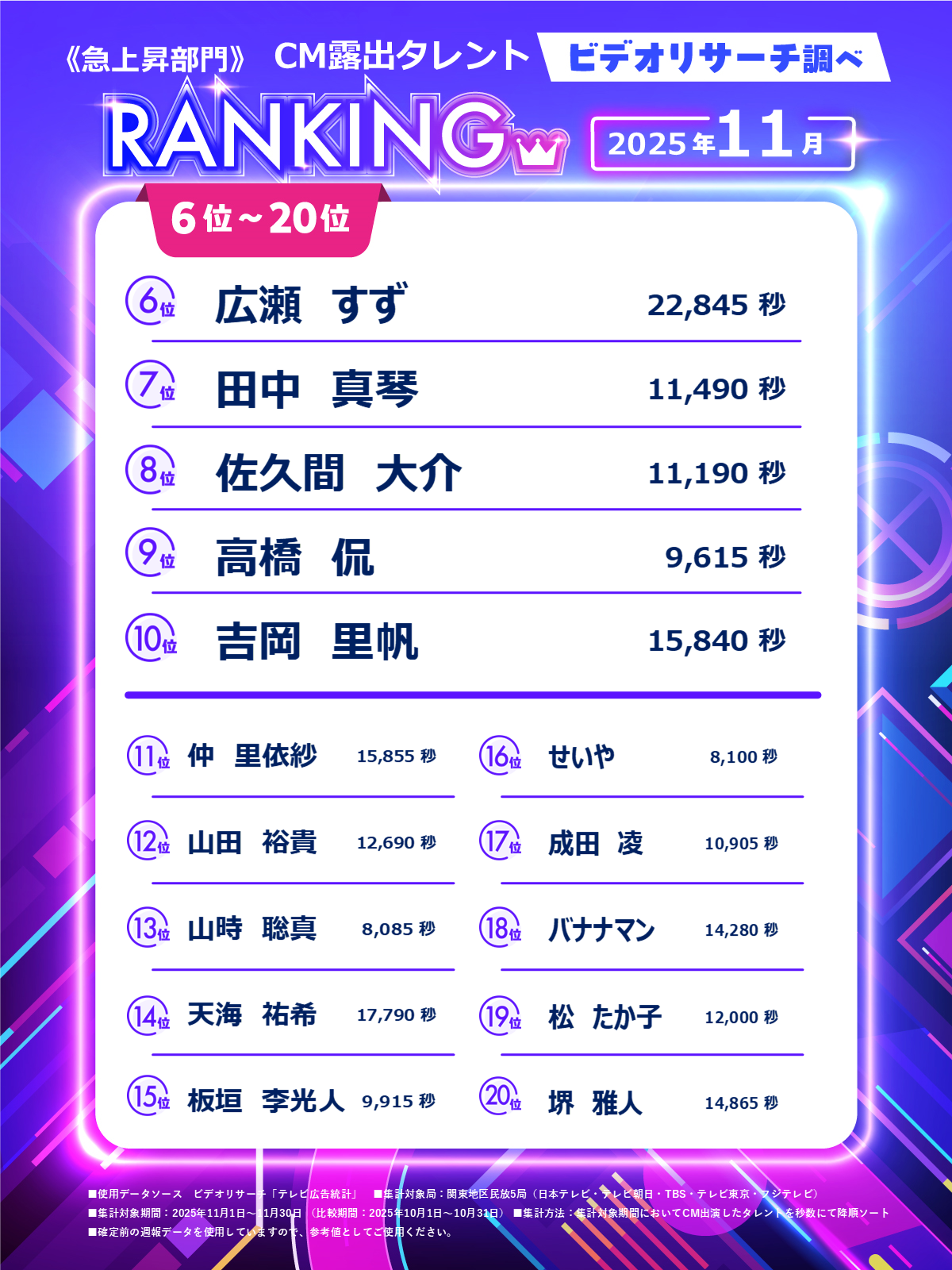 【25年11月版】ビデオリサーチ調べ!CM露出タレントランキングTOP20