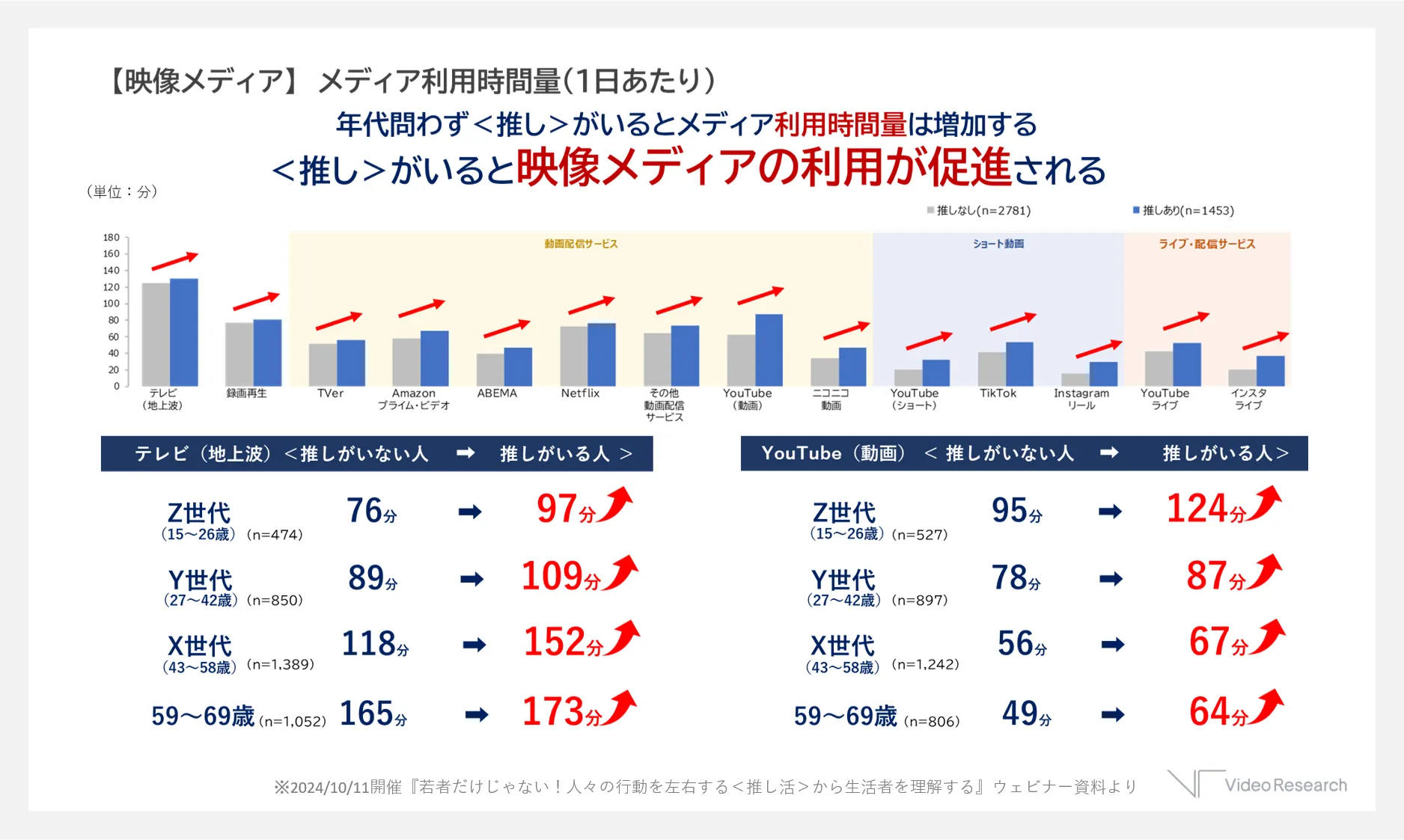 「映像メディアの利用」について調べると、年代問わず「推し」がいるとメディアの利用時間量が増加しています。