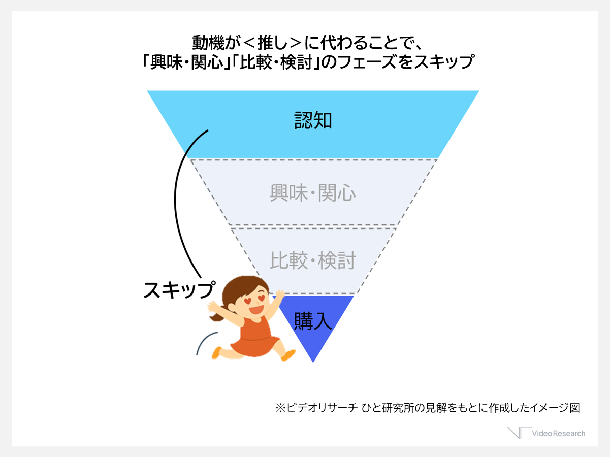 通常の購買プロセスは、「認知 → 興味関心 → 比較検討 → 購入」という流れが一般的とされていますが、<推し>が関与し購買の動機となると、認知のあと、興味関心や比較検討のフェーズをスキップして一気に購入に至るということが起こります(図3)。これが、ひと研究所が考える<推し>をマーケティングに活用するとモノが売れるという現象の実態と考えます。