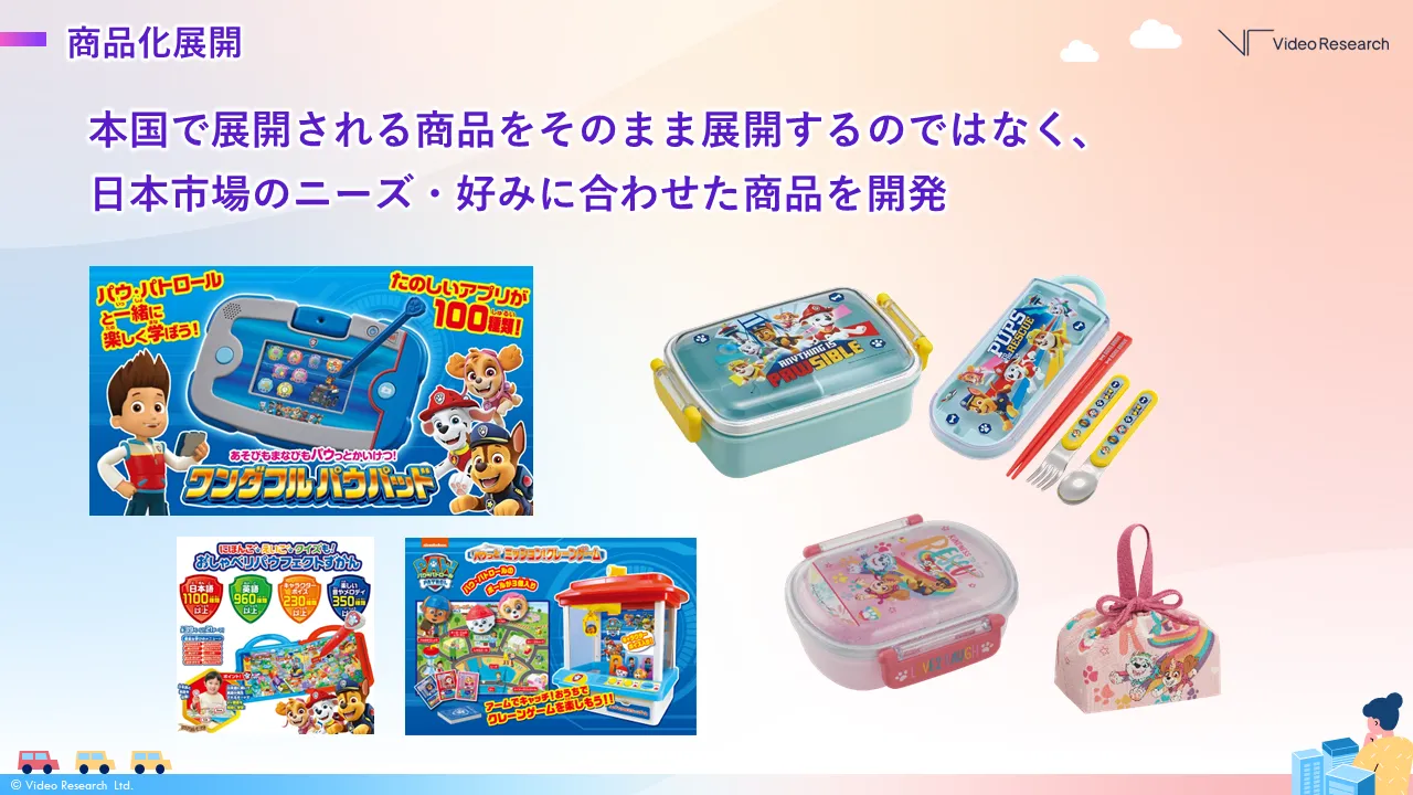 実際に『パウ・パトロール』の商品市場規模は直近3年間、2~2.5倍で拡大。木村氏の報告では、当初はタカラトミーの玩具中心だったものが、現在ではアパレルや生活用品など玩具以外の商品が半分以上を占めているそうです。