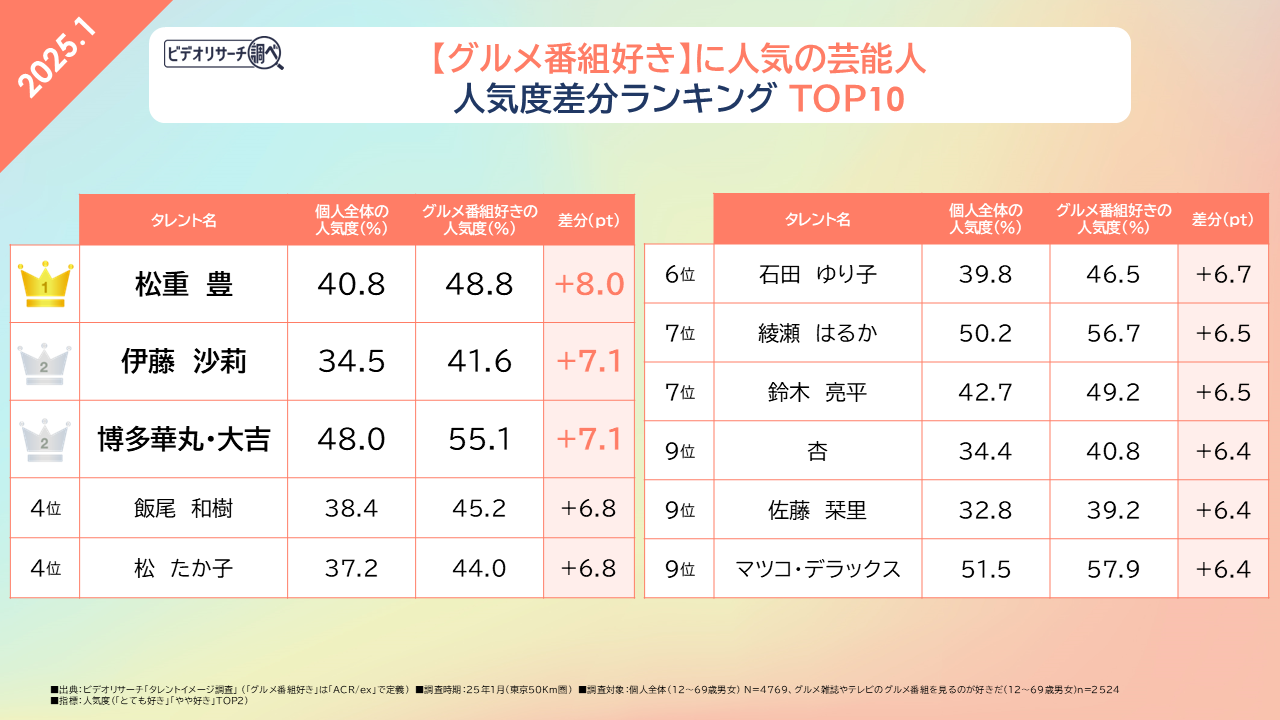 はじめに、<「グルメ雑誌やテレビのグルメ番組を見るのが好きだ」と回答した人>と<個人全体>とのタレント人気度の差分をランキング形式で紹介します。【グルメ番組好き】に特に人気の芸能人は誰でしょうか。