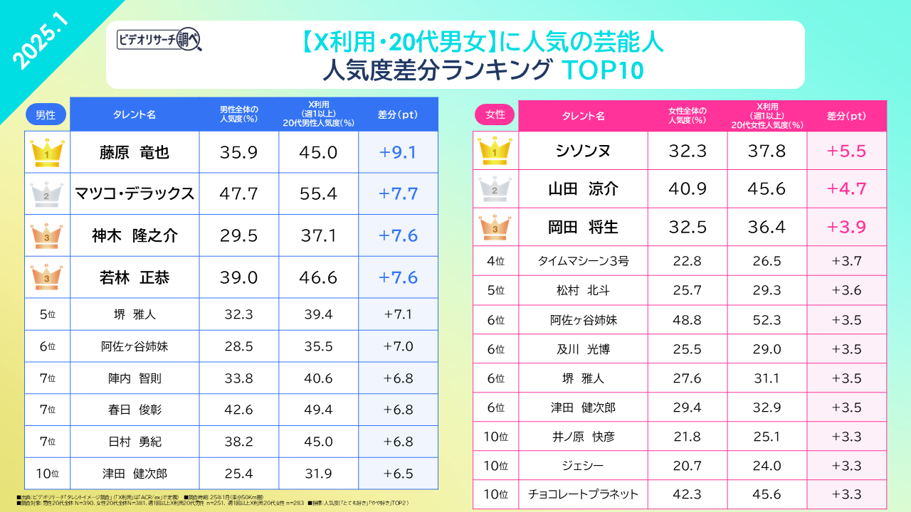 【X利用・20代男女】に特に人気の芸能人は「藤原 竜也」と「シソンヌ」 芸人を筆頭に多彩なジャンルが人気
