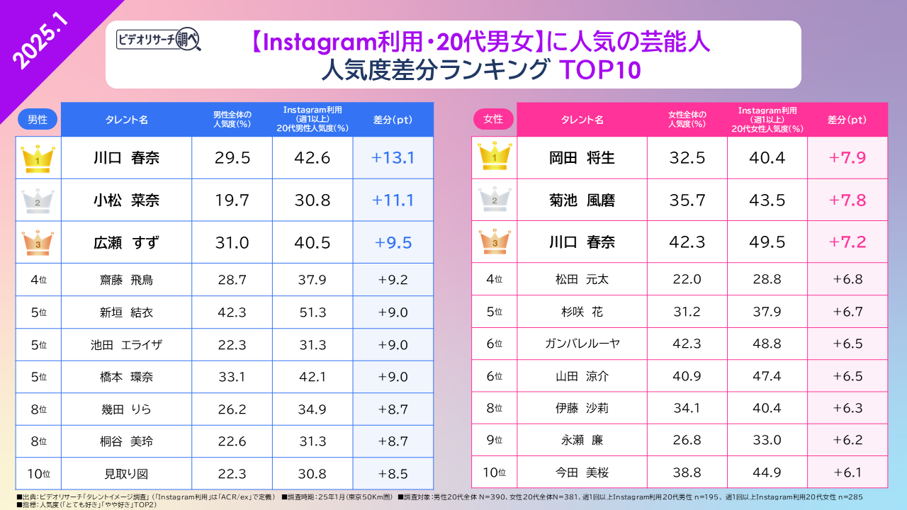 【Instagram利用・20代男女】に特に人気の芸能人は「川口 春奈」と「岡田 将生」 女優・アイドルらが多数ランクイン