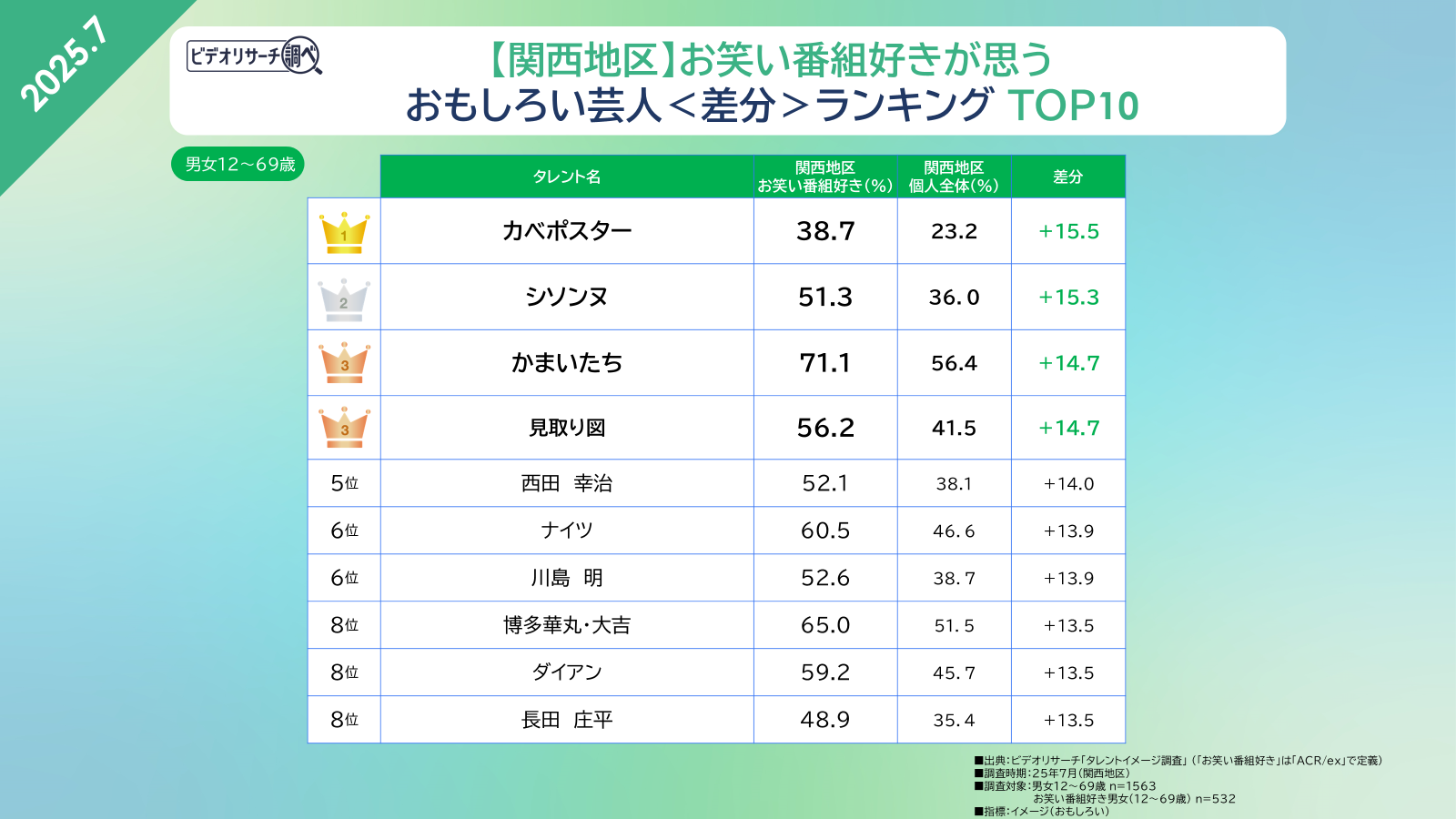 ビデオリサーチでは、50年以上にわたり、「タレントイメージ調査」を実施しています。2024年からは関西地区での調査を開始しました。今回は「関西地区」に焦点を当て生活者データ「ACR/ex」の調査結果とかけあわせることで、<お笑い番組が好きな人>がおもしろいと思う芸人の傾向についてランキング形式でみていきます。