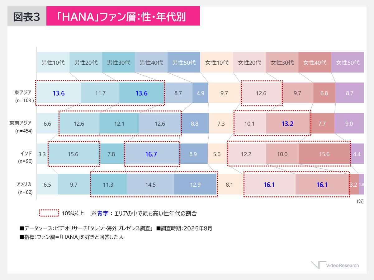 デビュー直後にもかかわらず世界で着実に人気を広げている「HANA」。今回は、「HANA」を好きと回答したファン層の特徴について、東アジア、東南アジア、インド、アメリカの4エリア別に一部データをご紹介していきます。