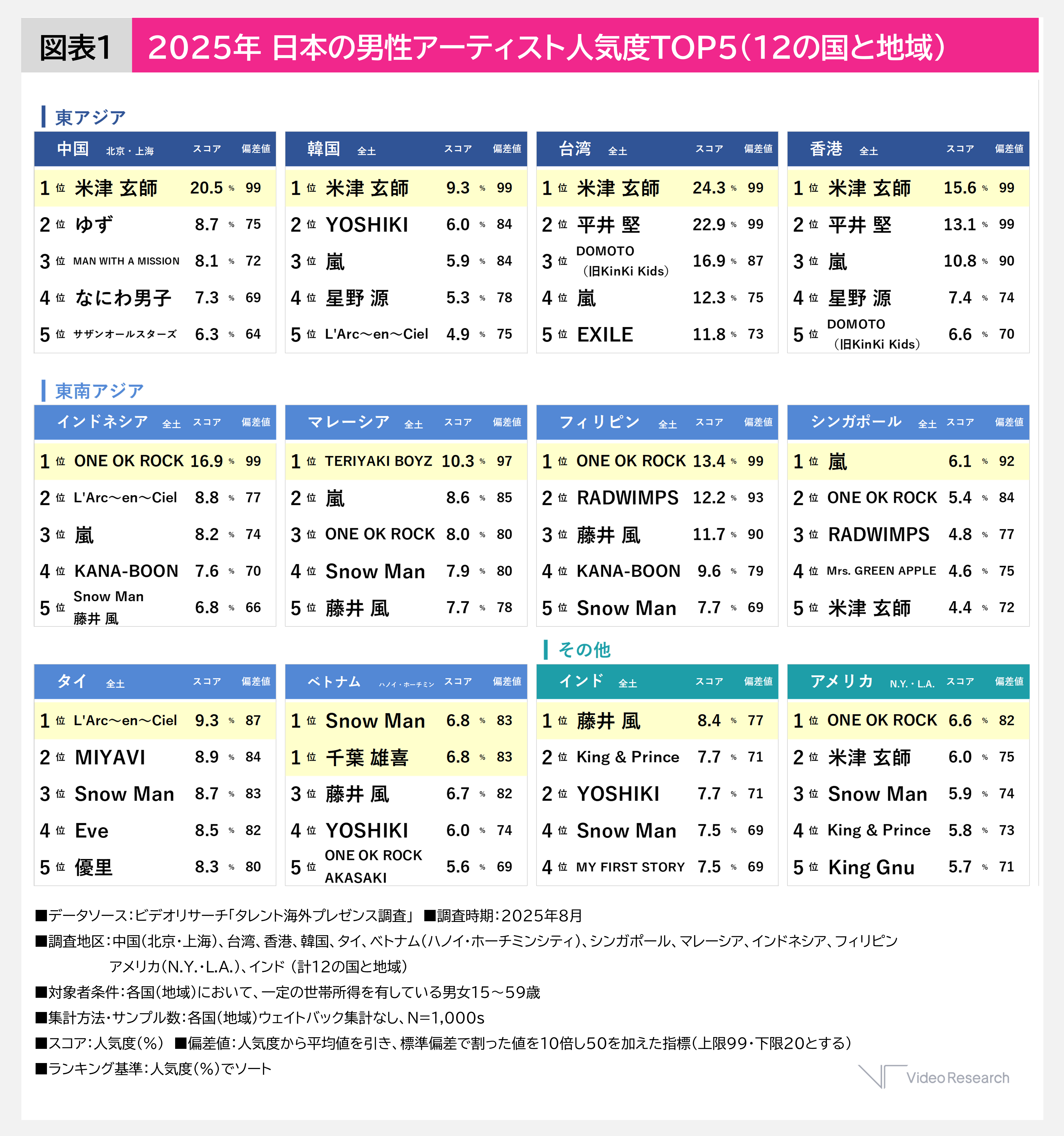 ■男性アーティスト人気度TOP5「Snow Man」最多7カ国でランクイン!「米津 玄師」は東アジア圏首位独占