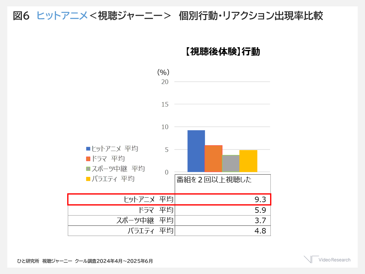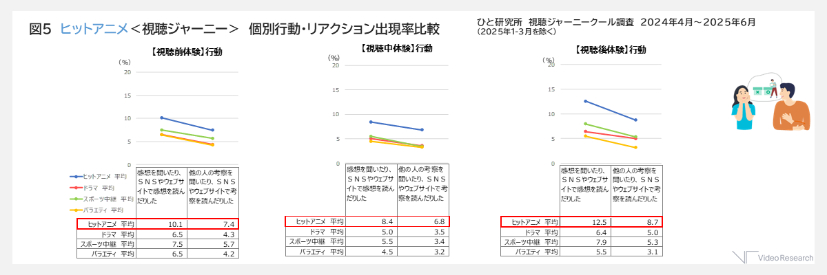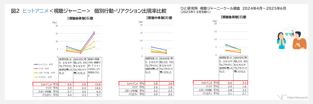 まずアニメは、オフラインで誰かと話したりSNSで書き込みをしたり、録画予約やお気に入り登録をするなど放送を心待ちにするような行動が、他のジャンルに比べて多く見られました。