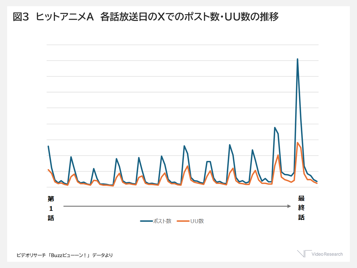 当社の「Buzzビューーン!*1」(図3)を見ても、とあるアニメではユニークユーザー数(視聴者の数)が回を重ねるごとに増えていく様子がうかがえ、新規の視聴者が広がっていく様子が見られます。