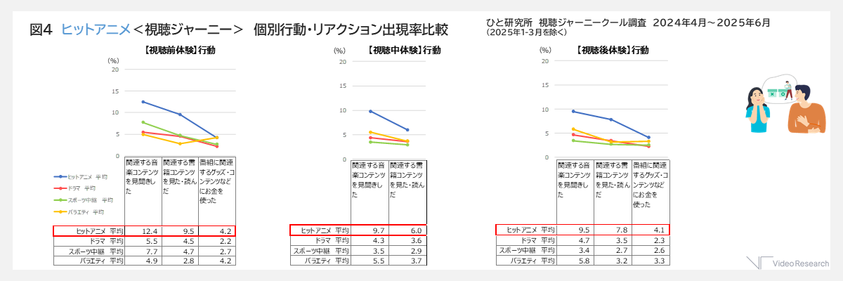 ヒットアニメは他のジャンルに比べると、視聴前・視聴中・視聴後いずれも「関連する音楽・書籍コンテンツを見聞きした」「感想を言ったり、SNSに書いたりした/見聞きした」「家族や友人などに視聴を勧めた」という人が多い傾向でした。