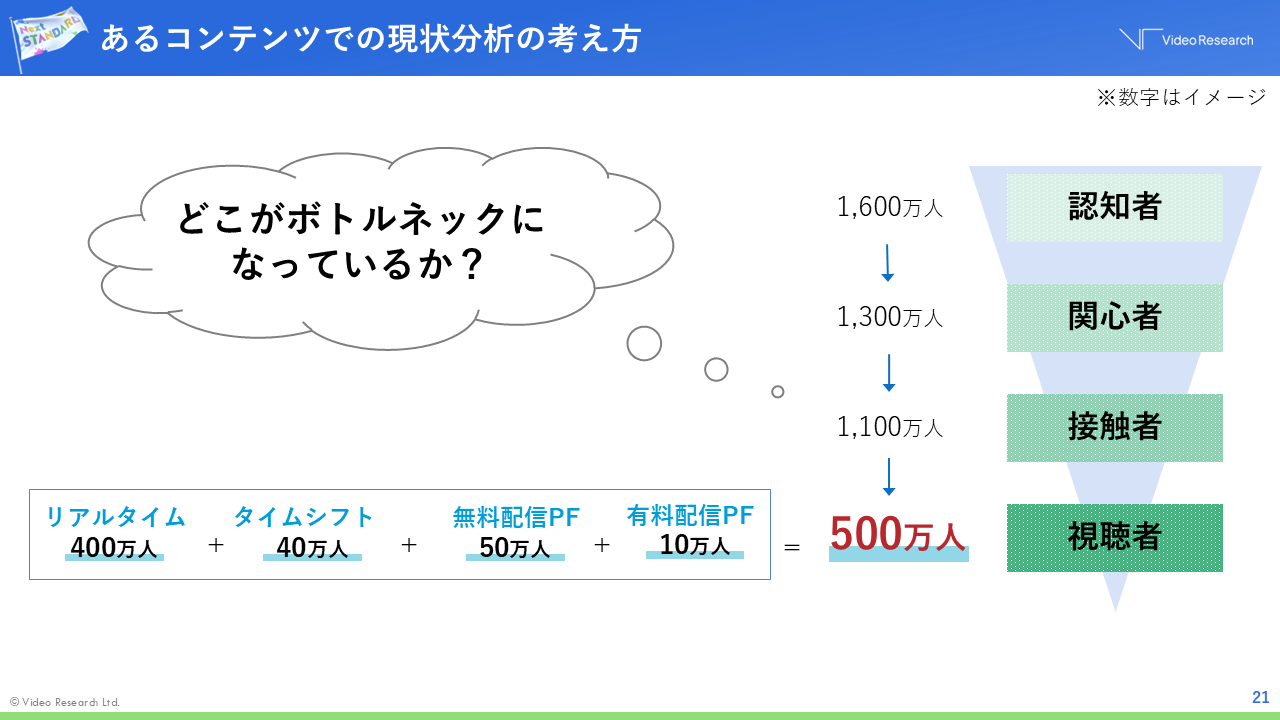 その詳細について、まずは「現状分析」の例を用いて説明しました。数字はダミーですが、リアルタイムで400万人、タイムシフトで40万人、無料配信で50万人、有料配信で10万人の合計500万人が視聴したコンテンツがあったと仮定します。このとき、500万人という視聴人数をさらに大きくするために考えるべきは「視聴に至るまでの過程」です。