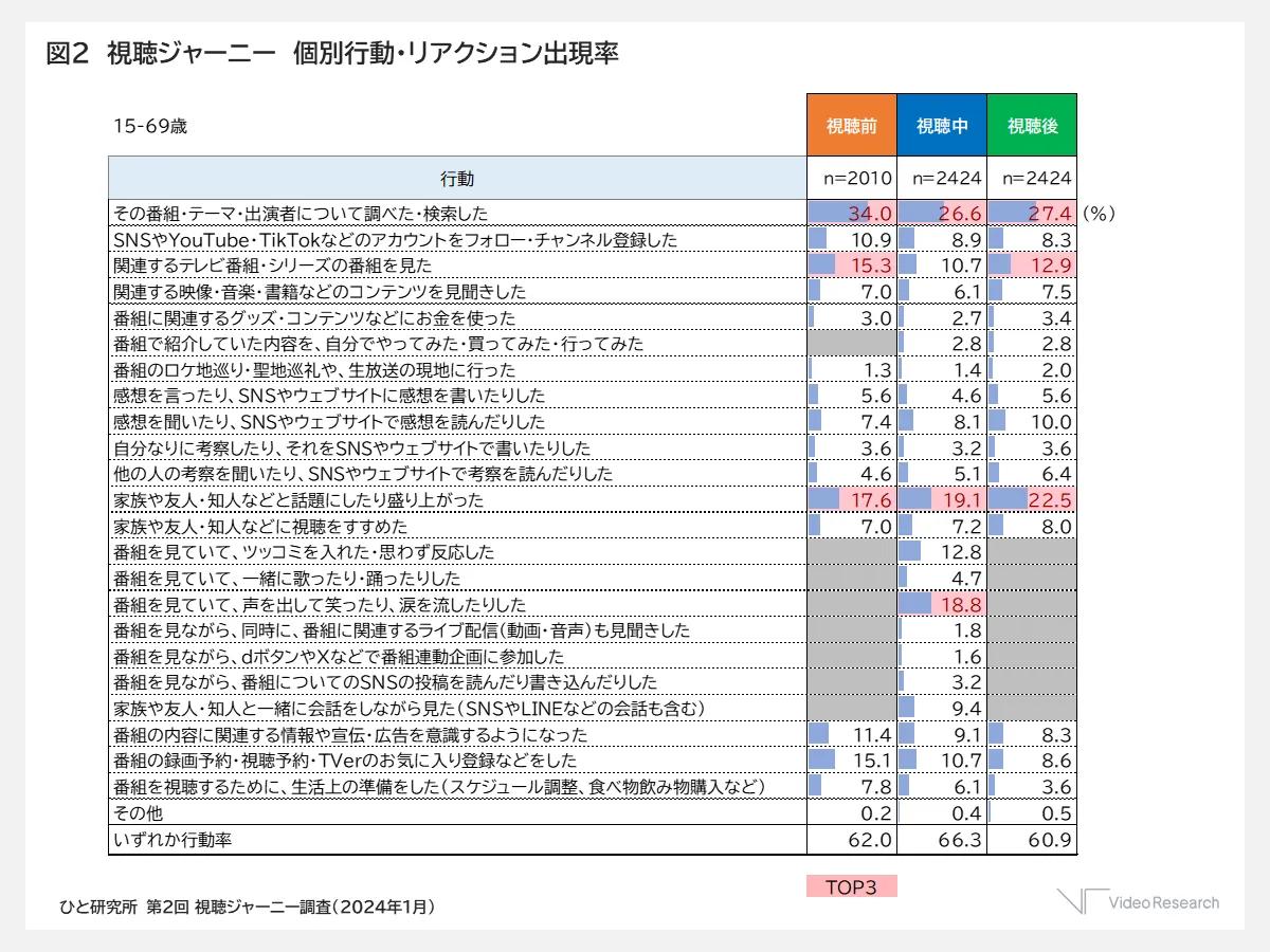 まず、回答が得られた延べ2424番組について、具体的な視聴ジャーニー(個別行動・リアクション)の出現率をみてみます(図2)。