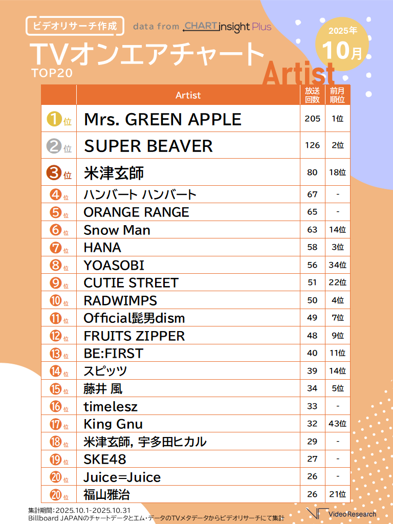 米津玄師、Snow Man、YOASOBIらがランクアップ!TVオンエアチャートTOP20~アーティスト編~【2025年10月版】