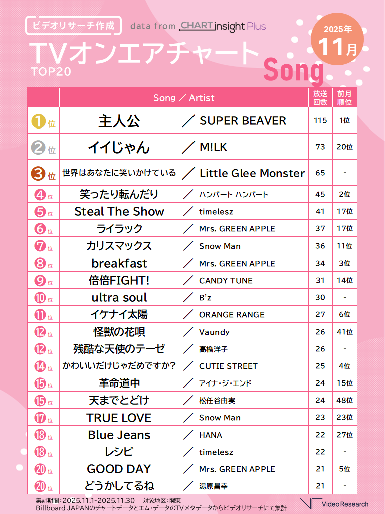 M!LK「イイじゃん」、リトグリ「世界はあなたに笑いかけている」などがTOP10入り! テレビでよく聞く人気楽曲ランキング「TVオンエアチャートTOP20」【2025年11月版】