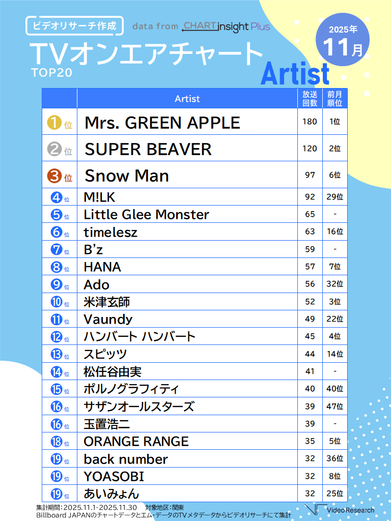 2025年11月にテレビで取り上げられた回数が多かったアーティスト1位は、Mrs. GREEN APPLE。6月から、6か月連続の1位となりました。11月3日には、TBS系で冠番組「テレビ×ミセス」が放送され、大塚愛「プラネタリウム」のコラボ歌唱、チョコレートプラネットとのコラボコント、M!LKとの「イイじゃんゲーム」対決などが放送されました。また、11月に発表されたJOYSOUNDのカラオケ年間ランキング、DAMのカラオケ年間ランキングともに「ライラック」が1位を獲得。2025年発売楽曲でも「ダーリン」が1位を獲得し、カラオケでもMrs. GREEN APPLEの楽曲に人気が集まったことが民放各局の情報番組で報じられました。