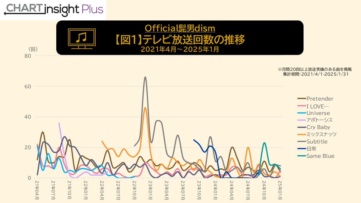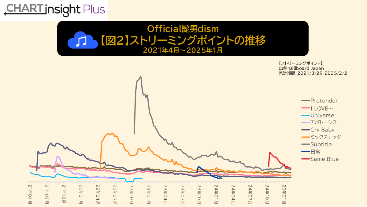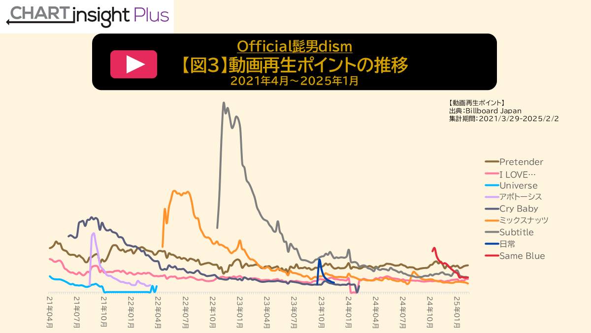 2022年10月にリリースされたOfficial髭男dism「Subtitle」は、同年10月期のフジテレビ系木曜劇場「silent」の主題歌で、Billboard JAPANの総合ソング・チャート"Japan Hot 100"では、2023年の年間2位を獲得しました。ここでは2021年4月~2025年1月のデータを用い、Official髭男dismの他の楽曲と比較しながら、「Subtitle」のテレビでの放送回数や、ストリーミングポイント、動画再生ポイント(YouTubeでの公式MV再生数に基づいたポイント)の推移を振り返ってみます。