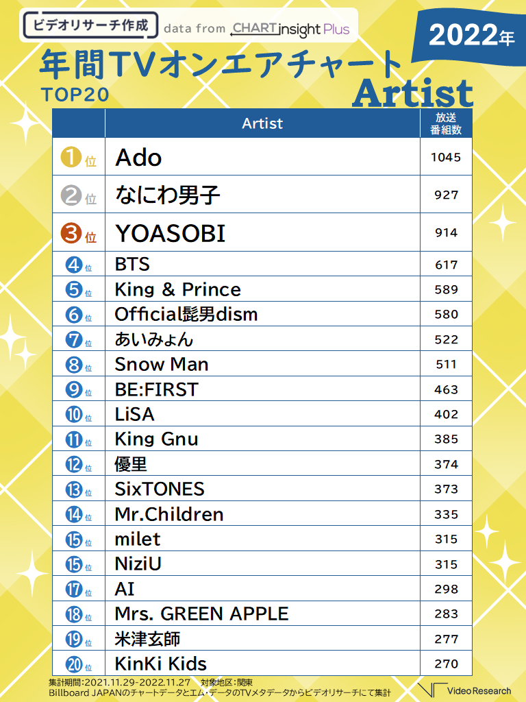 トップ3は楽曲編でも上位のAdo・なにわ男子・YOASOBI!年間TVオンエアチャート~アーティスト編~