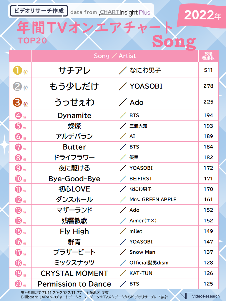 【2022年版】楽曲はなにわ男子「サチアレ」が首位獲得!アーティストはAdo・なにわ・YOASOBIがTOP3!年間TVオンエアチャート