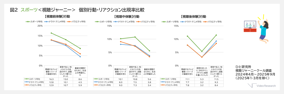 また、視聴前は「番組を視聴するために、生活上の準備」をしてワクワクして待機する様子が見られ、視聴中は身近な人とコミュニケーションを取りながら気持ちの盛り上がりを高め、視聴後は「SNSやウェブサイトに感想を書いたり」オンラインで余韻を楽しむという人も他ジャンルと比較して、多くいました。