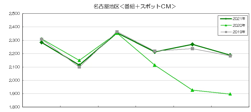 テレビCM総出稿量は、関東・関西・名古屋3地区とも前年2020年の上半期は新型コロナウイルス感染症拡大による経済的な影響等により、大きな落ち込みをみせていましたが、徐々に回復。2021年上半期はコロナ禍以前の2019年同時期と同程度、例年並みの出稿量となりました。