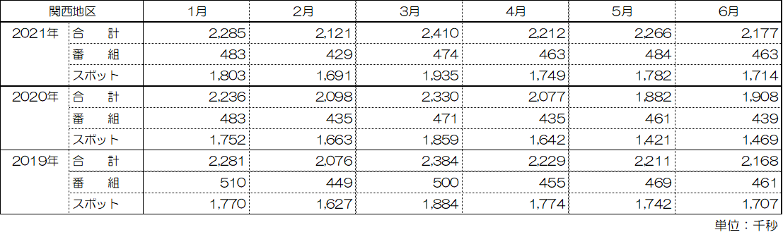 2021年の上半期CM出稿量の推移(テレビ局広報CMを除く民放5局合計)