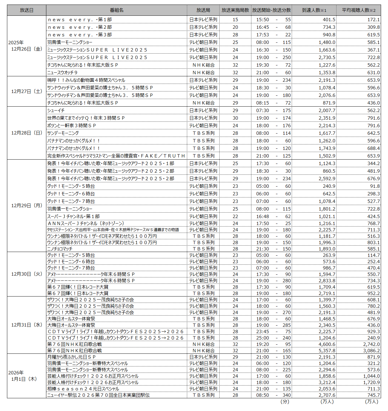 2025-2026年の年末年始(12月26日~1月1日)の番組は全国で何人が見た?