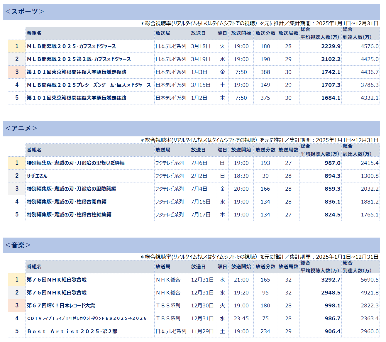 株式会社ビデオリサーチ(本社:東京都千代田区、代表取締役社長執行役員:石川 豊)は、全国32の全放送エリアにて、毎日、個人単位のテレビ視聴状況をリアルタイム視聴および、タイムシフト視聴も対象に調査を行っています。今回、総合視聴率を元に算出した2025年の全国推計視聴人数を取りまとめましたのでお知らせします。
