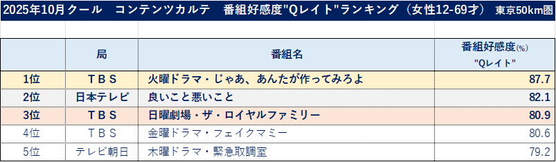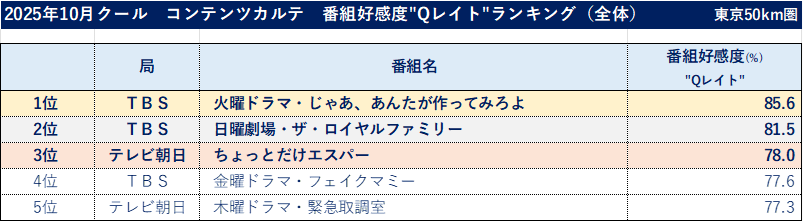 ■ 2025年10月クール_番組好感度ランキング、全体1位は夏帆・竹内涼真が主演の「火曜ドラマ・じゃあ、あんたが作ってみろよ」